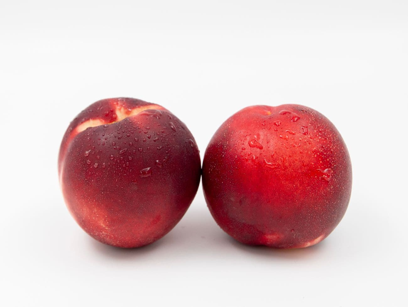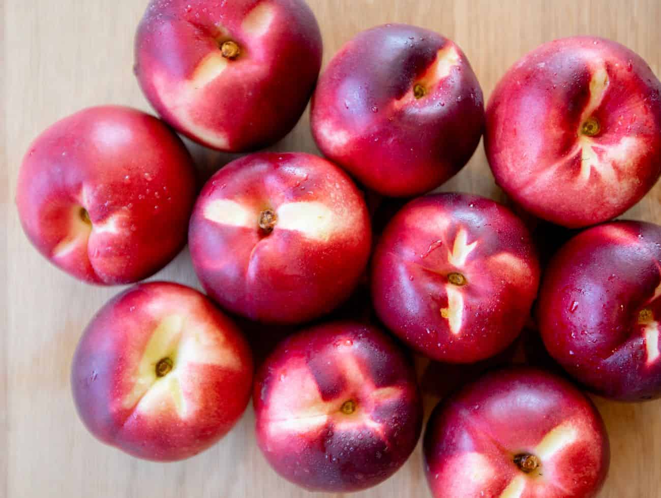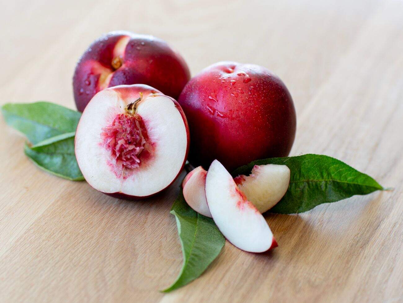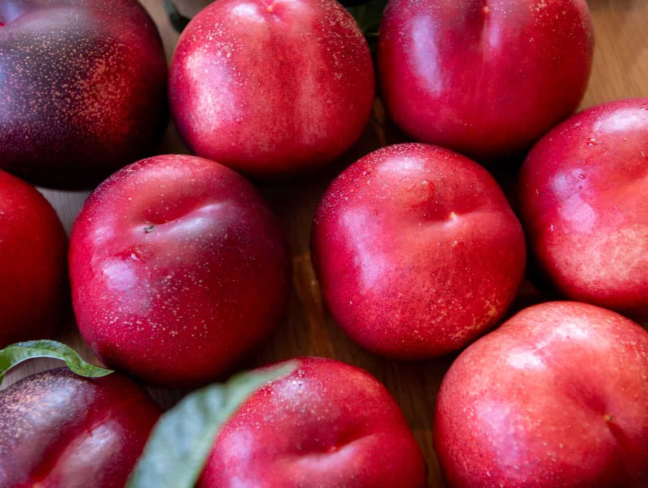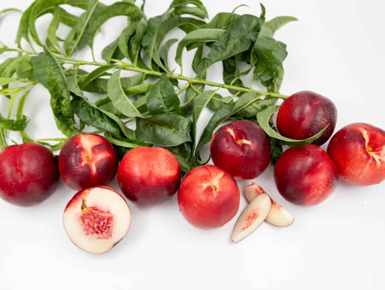 Beautiful, bright red-skinned, white-fleshed nectarine with striking red bleeding around the stone.